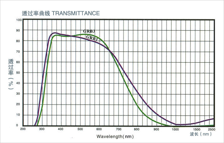 GRB1、GRB3、(KG1、KG3)突出的特点是对可见光的高透射和有效吸收红外线范围(特别对1064 纳米红外吸收),应用在冷光灯源产品上。如:手术室冷光灯,幻灯机、投影仪。